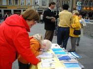 有一位德国女士告诉法轮功学员,她有一个画廊,最近有两位中国人要来办画展,她想让他们了解真象,她跟学员要了中文报纸,她希望会有很多的中国人来观看画展并了解法轮功真象。