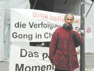 国际人权组织缇拉克先生在集会上对中国的人权现状進行了谴责,同时呼吁听众签名支持法轮功学员,并告诉大家,营救熊伟的成功有很大一部分靠了德国民众的签名支持。