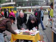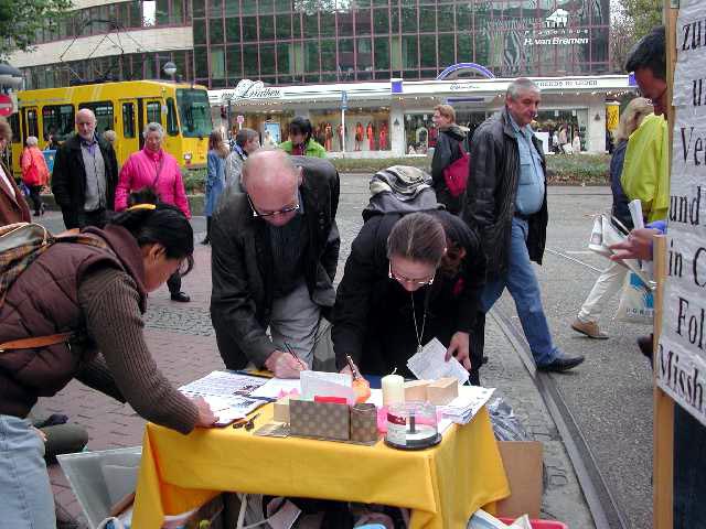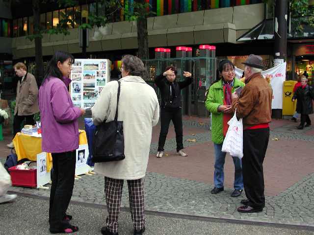 为了使人们真正了解真象,大家都很注重讲真象的实效,递上传单的同时,随口就讲解开了。大法洪传展板,酷刑真象展板,学员们祥和的炼功以及优美的炼功音乐,稍一加解说,善恶已然分明。这里的人们对法轮大法真象的反应越来越正面,很多人就是有耐心听真象,不听明白不离开。经常是几个学员同时向不同的人讲,一对一,一对二,或一对多个行人讲。明白了真象的人们,有的要签名反对迫害,有的想学功要炼功点的地址,当地负责义务联系的学员应接不暇,那边没回答完,这边已经又有人在等候。