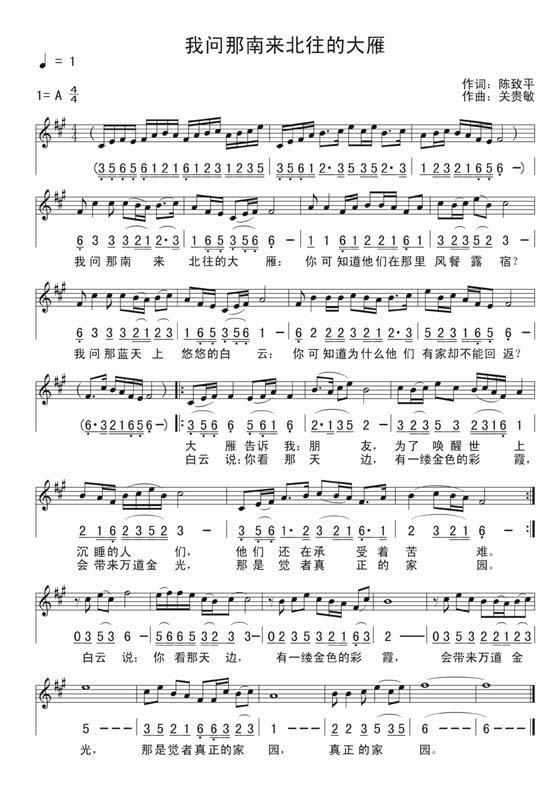 大雁告诉我:朋友,为了唤醒沉睡世上的人们,他们还在承受着苦难。白云说:你看那天边,有一道金色的彩霞,会带来万道金光,那是觉者真正的家园。