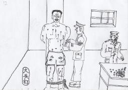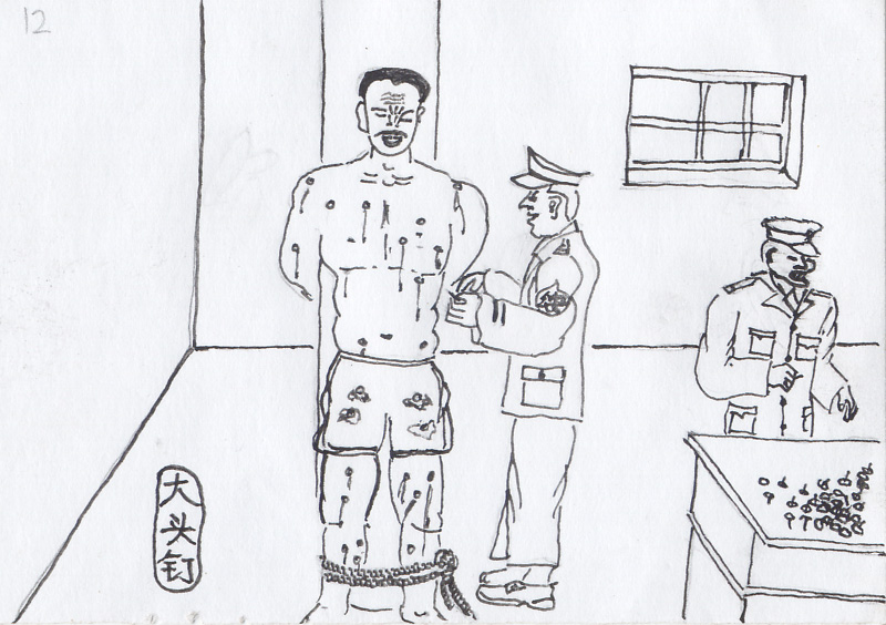钉大头钉:沈阳恶警在学员身上钉了100多个大头钉。