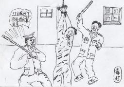 毒打:恶警把学员双手用细绳绑住吊起,用狼牙棒进行毒打,有时一直毒打几个小时。
