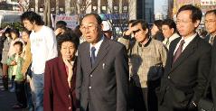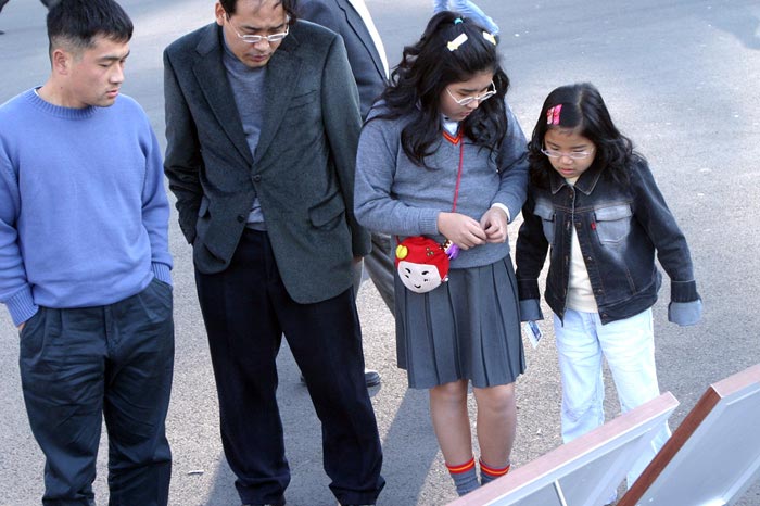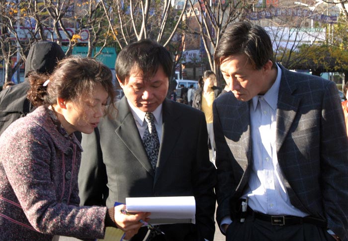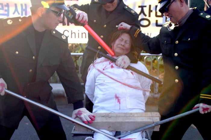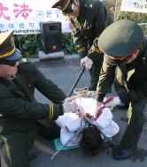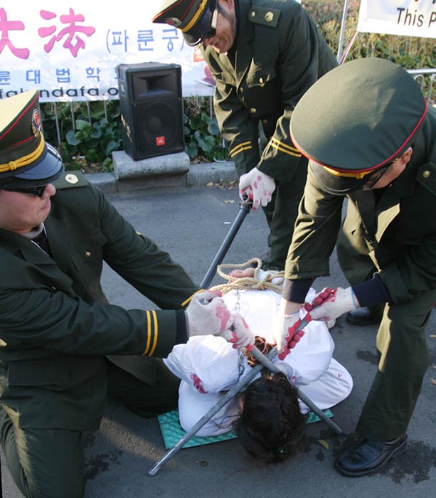 2004年12月5日星期日,釜山-庆南地区的学员们在釜山市的门户 ─ 釜山站广场举办酷刑展,再现法轮功学员5多年来在中国所遭受的肆意迫害。与此同时,真象图片展以及为营救被关押在中国的韩国人的朝鲜族妻子高成女的征签活动也一并举行。