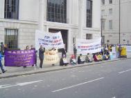 2004年12月10日世界人权日,英国法轮功学员在驻英中使馆前举行新闻发布会,提醒人们关注5年来在中国发生的对大陆法轮功学员的灭绝性迫害,呼吁将中共江氏集团以及帮凶绳之以法。