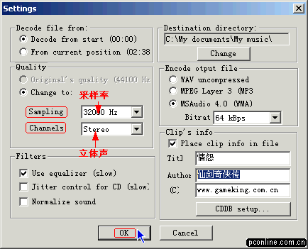 转换参数选择单击“Change”按钮可改变文件存储路径,在“Encode output file”栏中我们可以发现,转换成的格式可以是WAV、MP3、WMA,单击OK按钮转换开始。