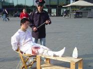 学员方先生已经71岁了,他连续4天参加酷刑展示,扮演承受多种酷刑的学员。他表示,在烈日下扮演受刑非常的痛苦,如果不是修炼了,在身体上根本无法承受。 但是,即使这么难受,他也要坚持,因为酷刑展示在讲真象上起到了很好的作用,能帮助人们了解法轮功受迫害的事实。方先生说法轮功这么好,教人做好人,但江××却非要镇压,还制造谎言,让人们仇视法轮功。我们要告诉人们法轮功好,让人们也能受益,让善良的人们了解真象,伸出援手,早日制止这场迫害,所以再辛苦也值得。