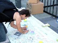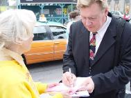 “我看到你们已经在这里坚持几个星期了,一天也没有间断。你们是怎么运作的?做这些的钱从哪里来?谁给你们提供资金?我想捐点钱支持你们的事业,但是你们又不肯收钱!那你们是从哪儿拿到资金的?” 一位居住在曼哈顿的先生不解的问。法轮功学员告诉他:“先生,我们都是用自己的钱。我们并不富有,但是我们用我们自己辛苦挣来的积蓄来做这些,目地是告诉人们法轮功被迫害的真象。让人们有机会选择站在正义的一边。”