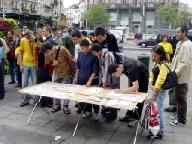 2004年9月11日在比利时布鲁塞尔市中心举办的反迫害酷刑展中,人们都非常希望了解更多的情况,认真的听取学员们的介绍。不管是老人还是孩子,都在静静的观看。很多人都感谢法轮功学员们告诉他们目前发生的这一切,并鼓励学员坚持反迫害。有的人含着泪在呼吁制止迫害的请愿书上签名。有位小伙子被中国法轮功学员在酷刑和虐杀下还坚持正义深深震撼,跑过去与法轮功学员坐在一起以表示支持。