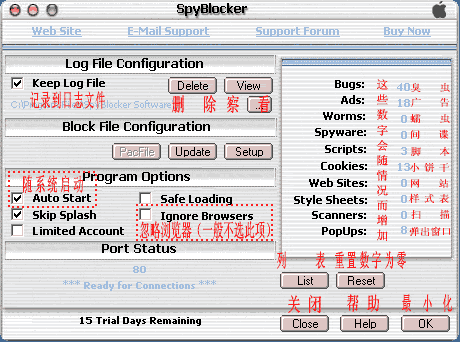 有同修询问Spyblocker的详细情况,现在最新版本是8.1,我选用了一张比较清楚的界面做介绍,因为该软件有换肤功能,同修可以自己在界面右击后点skin来选自己喜欢的界面。因为国内可能封锁此软件的官方网站,所以国内同修要通过自由之门点设置代理后下载。按照本图片来设置就好了,日志可以看自己是否需要而选择要或者不要。国外同修可选Safe Loading选项,但请国内同修不要选,因为会通过国外一个著名的代理服务器连接,而此服务器已被国内封锁。