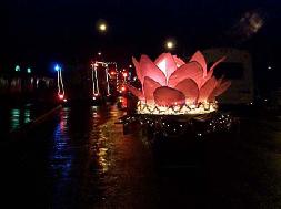 在雨中,一盏透亮的莲花灯缓缓而行。在它的前方,四名身着粉色长裙的法轮功女学员长袖起舞,手中的小莲花灯高旋低回,在夜色中划出晶莹的弧线;在它的后面,六名身穿金黄色炼功服的男学员整齐地向空中抻开双臂,向观众演示“佛展千手法”。莲花灯《政治家日报》游行报道的配文