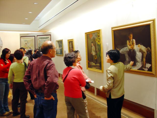 在酒店二层华盛顿和汉密尔顿大厅,参观者有幸观赏画展。“坚忍不屈的精神”画展陈列在汉密尔顿大厅,正中是著名雕塑家张昆仑的作品——佛像,大厅四周陈列着15幅作品,主要是油画和粉蜡画。画家汪卫星、王志平专程赶到波士顿参加画展,其中展出了他们的作品共9幅。