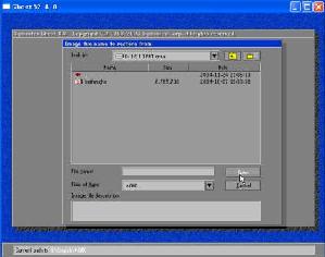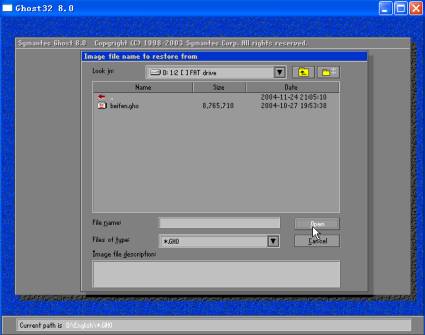 2.	选择后将显示以下界面,要求选择映像文件,因为之前将映像文件存在D:盘下的English文件夹下的Beifen文件中,选择该文件,点击“open”将映像打开