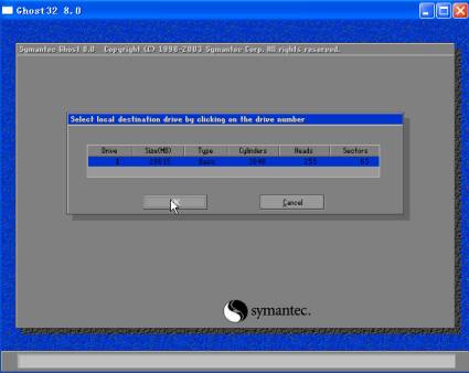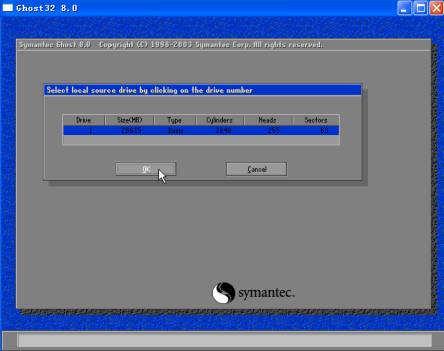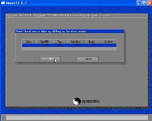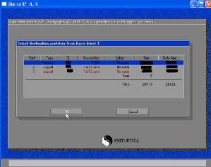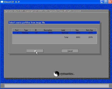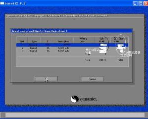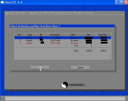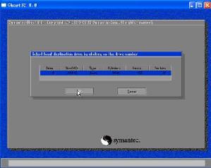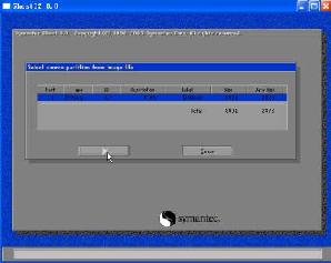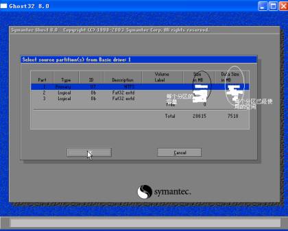 4.	完成上一步操作后就将进入如下图所示,选择所需要备份的分区,通常在图中分区号是以1,2,3表示的,由于我的电脑上有三个分区,所以就显示出三个来。一般来讲,1分区就对应着C盘。如果不放心的话,可以对照一下每个分区已使用空间的大小,以确定已择正确的分区。选择好所需要备份的分区后(本文所选用的是1分区,C盘),点击“OK”以确定。