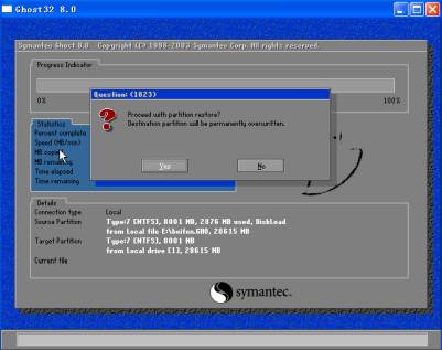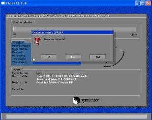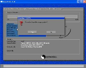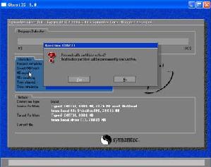 6.	此时电脑上提示“Proceed with partition restore? Destination partition will be permanently overwritten”, 意即“是否进行分区恢复?目标分区的数将被永久性覆盖。”此时若选择 “yes” 就将开始恢复映像,同时目标盘(这里是C盘)中所有数据将被覆盖,无法恢复。如果选no, 将退出。