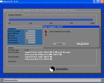 7.	完成后,电脑上将会提示:“Clone Complete Successfully” “映像成功恢复”这时选择 “Restart Computer” 重新启动计算机,就可以进入恢复后的系统中了。