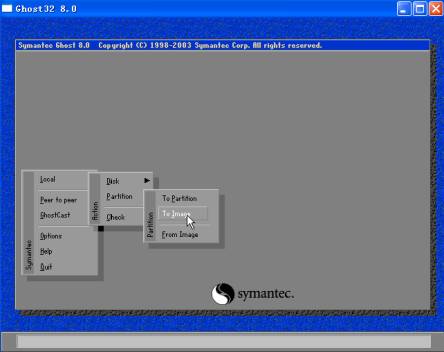 在主菜单中,”Local”表示本地磁盘,”Partition”表示分区,“To Image”表示到映像,那么将选择”Local – Partition - To Image”此操作就可以将C盘(当然也可以是任何盘)备份到映像文件中去。