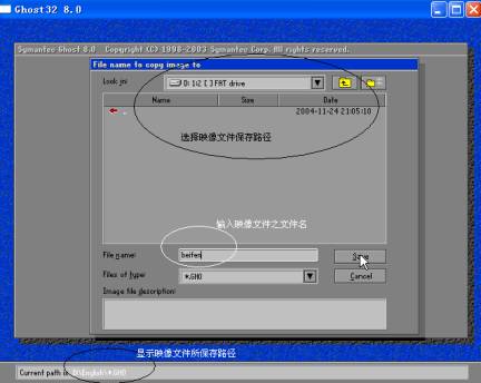 5.	选择映像文件存储的目录,在File Name 栏输入映像文件名。如这里是将映像文件保存在D盘的English文件夹中,映像文件取名为Beifen。注意文件名最好不要取中文,因为众所周知,Dos对中文文件名支持不好。选择好后,点击”Save”