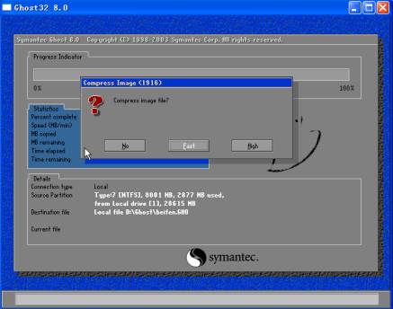 6.	下一步就将进入备份文件的制作。画面中将显示”compress image file?”意即是否压缩映像文件,这要根据硬盘空间大小决定,如果硬盘空间够大,就不用压缩以节省空间,即选择“no”,如果硬盘空间有限,就可以选择“fast”或“high”。选”high”即最大压缩,但是最慢,选”Fast”即一般压缩,速度较选最大压缩快,较选“no”慢。
