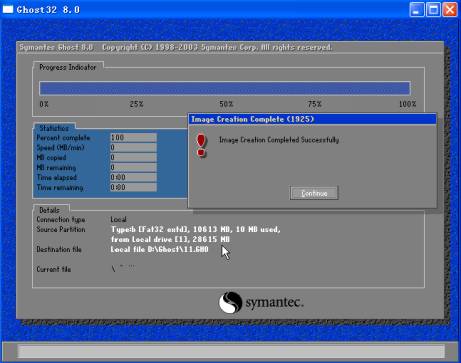 7.	选择后,就将开始映像文件的创建。这时”Progress Indicator” 进程指示将显示完成的比例,当文件创建完成后,将显示“Image creation Successfully”指映像成功创建。这时单击“Continue”就将回到第二步所示的界面,映像文件创建完成。