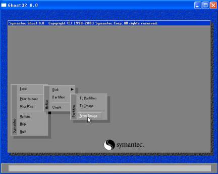 1. 首先用系统盘启动,进入Dos界面,运行Ghost,然后如下图,选择 Local – Partition – From Image, 此操作就是将映像文件恢复到磁盘分区当中。注意一旦完成操作,原分区(这里是C盘)里的文件将全部回复到创建映像文件之时,所以当使用这个功能时,一定将重要文件都存储在非C盘。