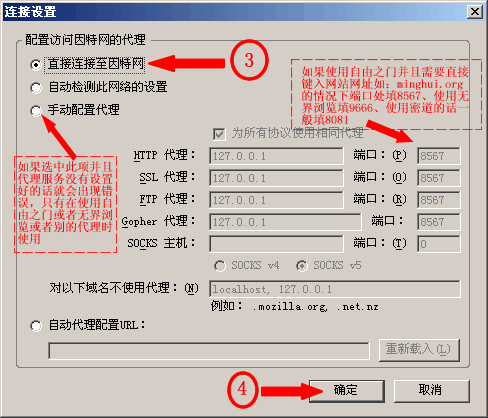 (3)Firefox 与 Windows XP 、Windows 2000 配合工作得很好,但与 Windows 98 SE 就差一点,你需要设置一下 Firefox 的代理,比如 G2 的代理是 127.0.0.1 : 8081,然后在地址中输入 WWW.MINGHUI.ORG 就行了;