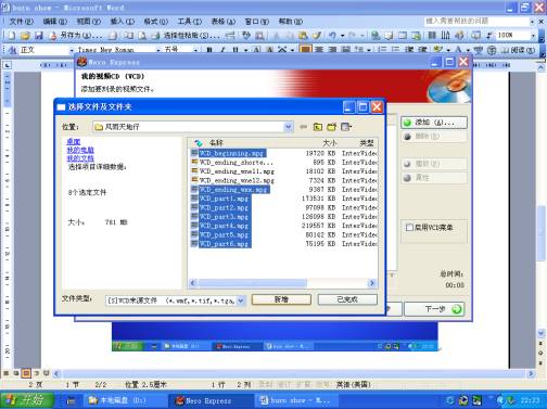 通过对话框找到要刻录文件的文件夹,并选择要刻录的文件(即图中的阴影加深的文件,注意此处我只选择了8个文件,但是大小也达到了781M,超过了一般光盘700M的容量),之后点击“已完成”按钮。