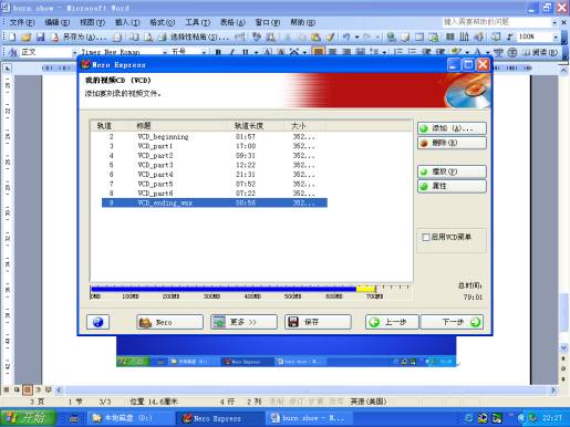 在Nero中还可以改变刻录的具体顺序,如我就把刚才在上面的片尾文件挪到了最后(只要用鼠标选中文件向下拖动即可)。之后点击“下一步”。