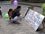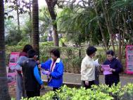 来往的行人中大部分都是全家共同出来游玩的,有不少小朋友的目光不断的注视着法轮功小学员手中的汽球。小学员年纪虽然小,可是又有礼貌又亲切的上前去说:“你好啊!汽球送给你,法轮大法好!!”小朋友们也高兴的说谢谢,而妈妈们总是愉快的笑着,看着我们给她的资料。其中一位妈妈点点头说:“看看这小学员,的确很纯净很乖巧。我们也可以让小孩学哦!”特别的是,有个一家四口出游的小男生,经过功法表演前面时,就主动跟妈妈说他想来学功呢。