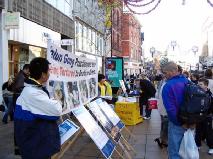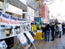 一些行人驻足与学员们交谈,了解详情,有的久久不肯离去。有的人甚至再三转回来细细阅读展板。当华灯初上,展览就要结束时,晚来的人们索要法轮大法真象报纸回去细读。两天的展览下来,莱斯特市许多善良的市民们了解了法轮大法的真象。