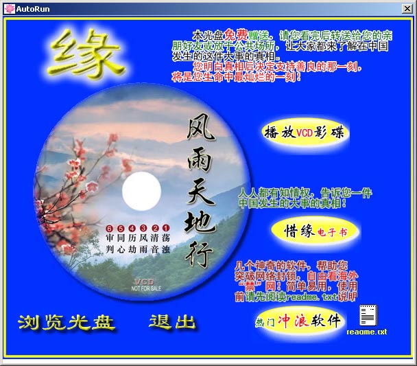 使用这个“风雨天地行的光盘自动运行包”制作出的光盘,插入电脑光驱后,屏幕上就会自动显示出一副很漂亮的画面,有“播放VCD影碟”、“惜缘电子书”、“热门冲浪软件”等几个按钮,用鼠标点击按钮,就会進行相应的操作。这个光盘自动启动包里含有“惜缘”电子书、和常用的几个破网软件,文件大小在5MB左右。这个电脑两用盘内容丰富,可以让人们从多个角度去了解我们,使人们更容易了解真象。