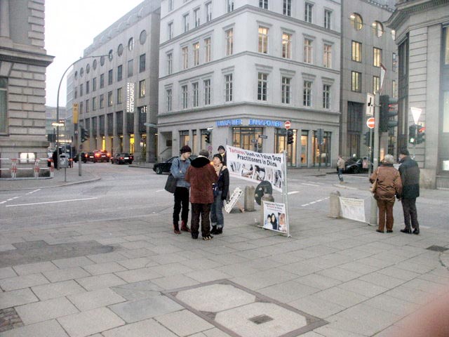 11月11日星期四,一位男子停下来与正在发迫害真象传单的学员交谈,他说:“你知道吗,在我们交谈之际,有一场以中欧会为主题的汉堡经济会议正在举行?”学员告诉他这就是我们在此的原因,他问为什么你们不在市政厅前请愿,让那些人们可亲眼看到反酷刑展?学员向他解释:“我们也很想把我们的展位设在那里,但是我们无法做,因为那个特别的地点是禁止進行请愿的。”这位男子告诉学员:那么你们应该在商务部或大西洋旅馆(Hotel Atlantic)外面集会。这位男子态度很认真的说,他想要让那些经济人士和中国代表团遇见学员们的反酷刑展。当学员告诉他我们会接受他的建议时,他感到非常高兴,深表感谢,然后在呼吁停止迫害的请愿信上签名,并拿了许多真象小册子。