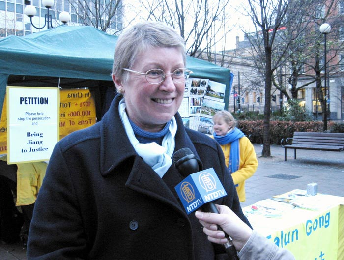 英国自由民主党国会议员派特希·卡尔顿女士(Patsy Calton MP, Liberal Democrats)在得知消息后带上助手专程从郊外赶来市中心声援本次展览。她对在现场采访的新唐人记者说道:“我认为提中国的人权问题是非常非常重要的,我对这几年在中国的法轮功学员的遭遇特别关注。我想说的是,我们不反对中国和中国政府,我们希望能看到与中国的贸易联系和文化交流的增加;但在同时,我们也必须重视每个人应该有的人权,这就意味着人们应该可以在任何时候修习这种不对政府构成任何威胁的平和的功法。”