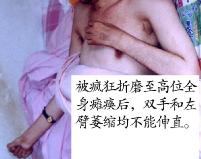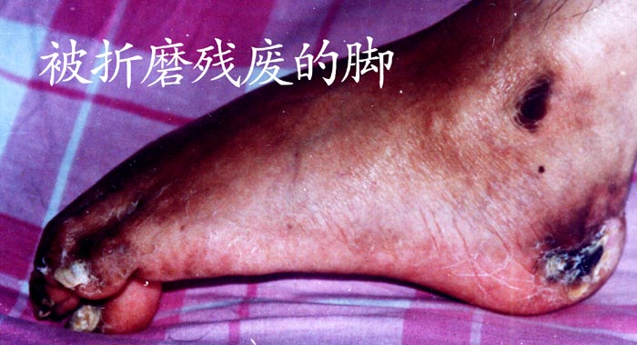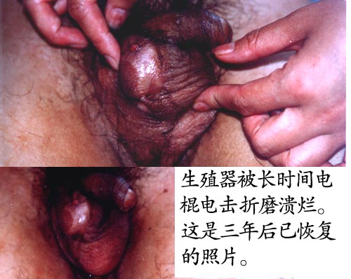 被折磨残废的脚 | 被长时间电击而溃烂的生殖器 | 血尿