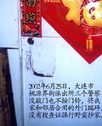 之后我们一直处于监视居住状态,公安经常上门骚扰,还扬言要抄家。2002年6月25日下午,桃源街派出所三名警察乘我妻子开门之机,用脚把门踹开,强闯进来抄家,胡说我们反政府(一对普普通通、与人为善的夫妻,而且其中一个已被残害致高位截瘫,有什么愿望、又有什么能力去反政府?),把家中的书籍坐垫等一切涉及到炼功的物品全部抄走,并威胁要把母子二人一块抓走。妻子当时被这突如其来的举动惊的不知所措,孩子也吓得直哭。第二天妻子领着孩子到派出所要东西,说:“你们没有任何法律手续,就擅闯民宅,强行抄家,是违法行为。”可他们却蛮横无耻地说:“穿这身警服就行。”真不知他们是人民警察还是土匪恶霸。