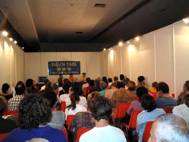 在博览会上,很多人因此而慕名前来法轮大法展位咨询、观看和学习功法;连续三天的法轮大法介绍会受到参观者的普遍欢迎,很多人早早就来到礼堂门口,排队等候入场。在介绍会上,学员们向与会者介绍法轮大法在中国和世界的洪传和使自己身心受益的体会以及当前在中国江氏集团对法轮功的残酷迫害;并为与会者演示五套功法和播放法轮大法的真象录像片。