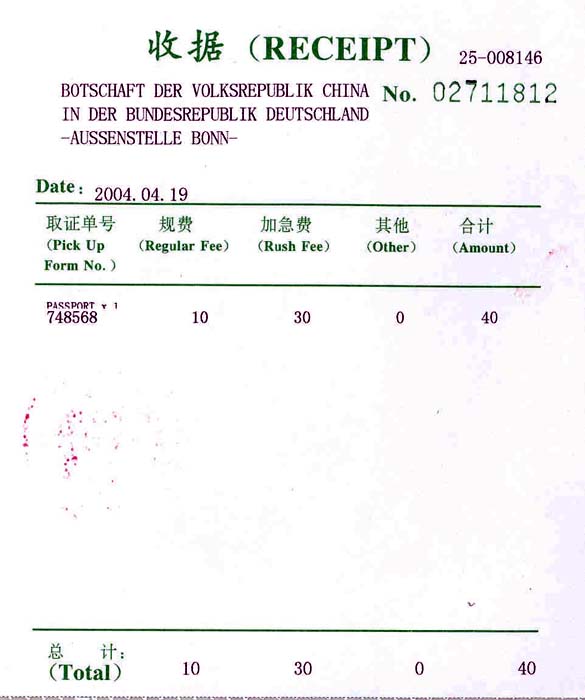 当时是上午10:40分左右。我象上次一样在办证窗口出示了我的结婚证和改名证明原件,并把所需复印件、护照原件和照片交给了窗口的那位女工作人员(和上次办护照延期是同一个人),并要求办特急,也就是一小时后取。她给我一张价目单,加注夫姓正常10欧元,特急附加费30欧元,一共是40欧元。她让我半个小时之后在交费窗口交钱。交完费之后我必须回到她所在的窗口,等待取回改好的护照。她让我等着。
