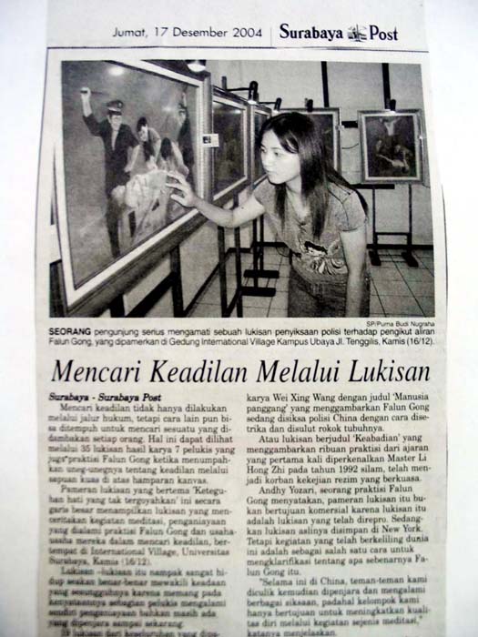 《泗水邮报》(Surabaya Post)的标题是“用绘画寻求正义”。文章说,正义不仅可以通过法律寻求,也可以通过任何人都想像得出的另外一种方式获得:7位艺术家、法轮功修炼者通过他们在画布上表现艺术感觉的方式寻求正义。