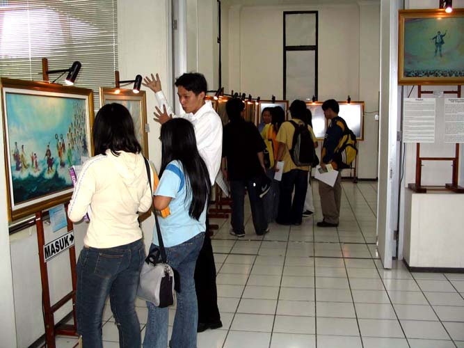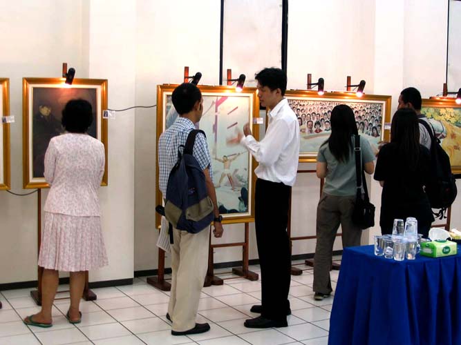 纯朴的泗水人为画中表现的精神所感动,仔细观看着,有些人流连忘返。参观者有国际村的西方留学生,其中有一位用相机把画面认真拍照下来;也有从中国来的访问学者。参观后,有法律专业的学生希望与学员另作专题研讨。