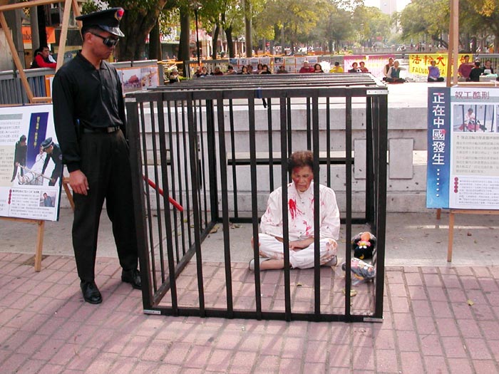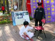 会场上最令人震撼的就是真人模拟的酷刑展示,展出的包括灌食酷刑、、奴工、吊刑、钉竹签、烙刑等,以及其它酷刑的图片展。事实上中共江氏集团非法迫害法轮功学员所使用的酷刑多达一百多种。这些酷刑展吸引了民众的围观,当他们在听到法轮功学员的详细介绍后,许多人主动签名支持反迫害,直说太残忍了,有的家长了解真象后,逐一介绍给她的孩子,主动当起传播真象的一员。整个场中人来人往,络绎不绝,走了一批又来一批。可以看到很多人看到真象后再听到学员解说时,都红了眼眶,流下眼泪。当法轮功学员们将正在发生的残酷手段予以曝光时,许多民众的正义和良知一个个苏醒。