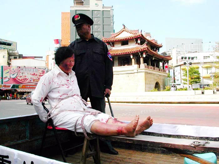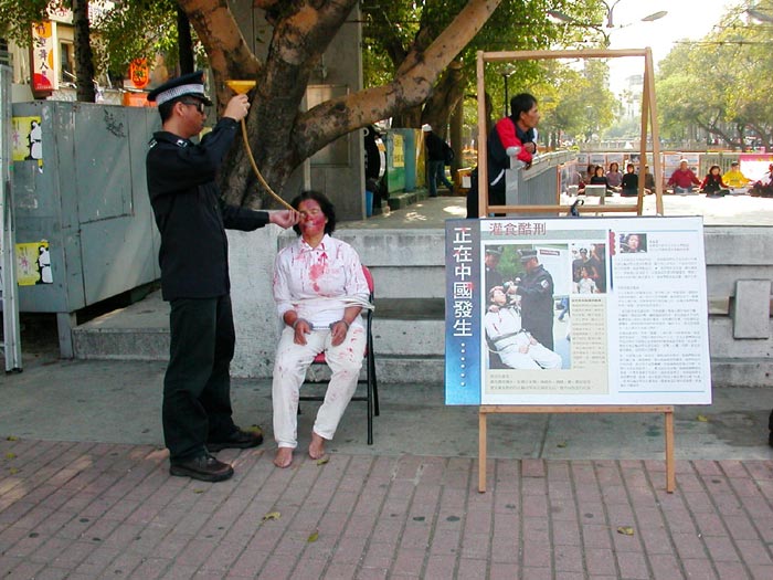【明慧网2004年12月22日】1999年7.20起,中共江氏集团开始非法镇压法轮功至今已经5年多了。法轮功学员为了让更多人了解这场非法的严重及残忍,于12月18日在台湾新竹市东门圆环举办了真人模拟的反展并举行了记者会,希望藉由这样的方式呼吁及早停止这场非法迫害。