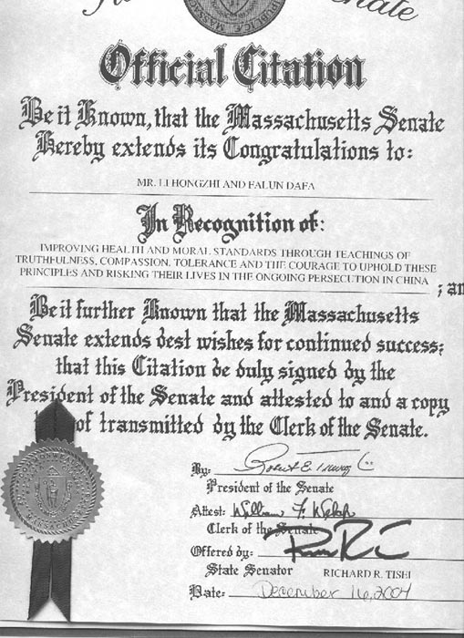 【明慧网2004年12月22日】麻省(即马萨诸塞州)参议员2004年12月16日发布公告褒奖李洪志先生和法轮大法。