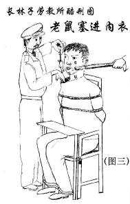 恶警把大法弟子唐绍勇锁在刑椅里,用电棍电击,并把一只大老鼠塞进他的内衣里,让大老鼠在他身上又跑又咬。(如图三)