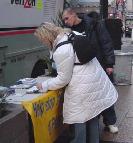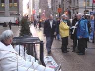 现在接资料的人越来越多,特别是白人接的很多,有些白人看展板,站在那里长时间听学员讲真象。早上我们在世贸中心打出的横幅:“很多你们的中国同事被蒙骗,并帮助传播中国共产党的谎言,不要被他们的话误导,你自己去看法轮功的真实故事。”几乎所有的白人路过时都看,接资料的人也很多。
