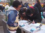 中国人接资料也多了。例如,有两个华人女大学生,刚开始不愿接资料,有个年纪大的女学员就与她们攀谈起来,她们就向学员问了许多问题,全都是受了中共江氏集团谎言的毒害,她们问,你们炼功为什么到天安门自焚,为什么不在家自己炼,等等。