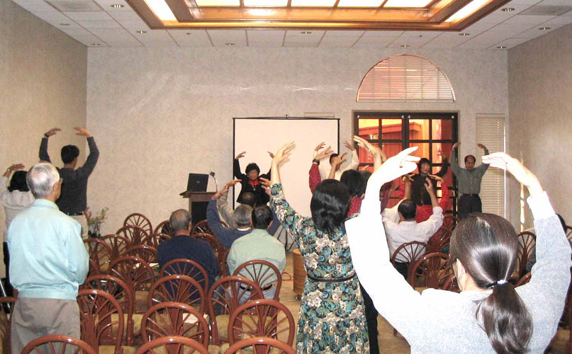 虽说活动是台湾社区主办,可是也有很多大陆来美的人士参加说明会。听了几位演讲人的介绍,与会人士发生了极大兴趣。学员演示功法时,他们纷纷离开座位,学了起来。有十几个人表示,希望参加九讲学习班,系统学习法轮功。