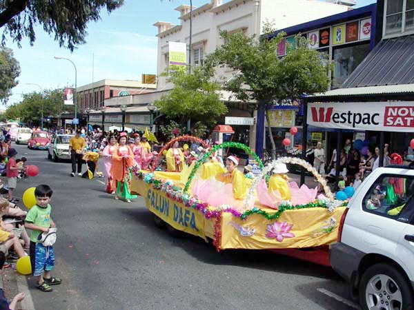 【明慧网2004年12月25日】2004年11月28日,在南澳阿德莱得的海滩胜地格林内尔(Glenelg) ,人们迎来了该区的第50届圣诞节庆祝游行,超过2万观众聚集在繁华的捷缇路(Jetty Rd)两旁观看了这次游行。有一支富有中华传统文化色彩的花车队伍引人瞩目,那是由本地中西方法轮功学员组成的花车游行队伍。