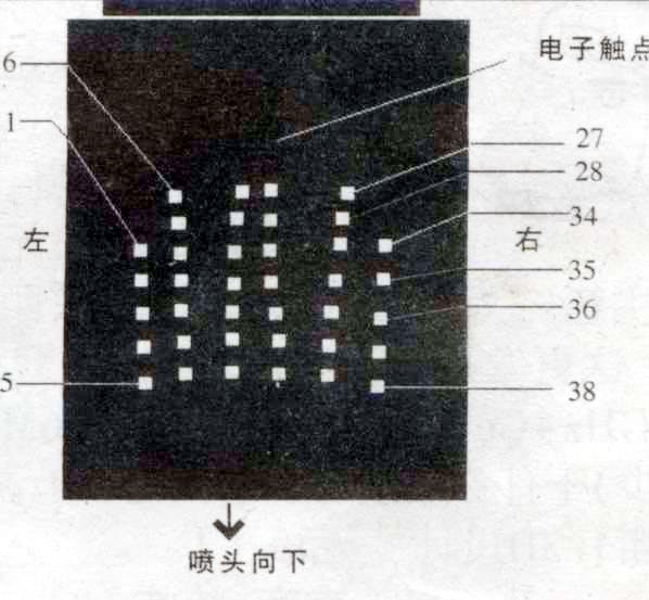 第三步:取6毫米宽的胶带,粘贴到电子触点27(彩色墨盒识别),28(彩色墨盒信息写入),34(写入芯片信息)脚上。