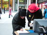12月24日是西方社会的圣诞节平安夜, 曼哈顿街头虽然少了往日的上班族的熙熙攘攘, 但在曼哈顿的一个个讲真象点, 还是不断的有明白真象的人们来签名表达反对迫害法轮功的愿望。