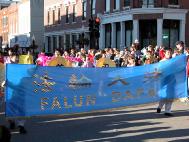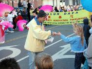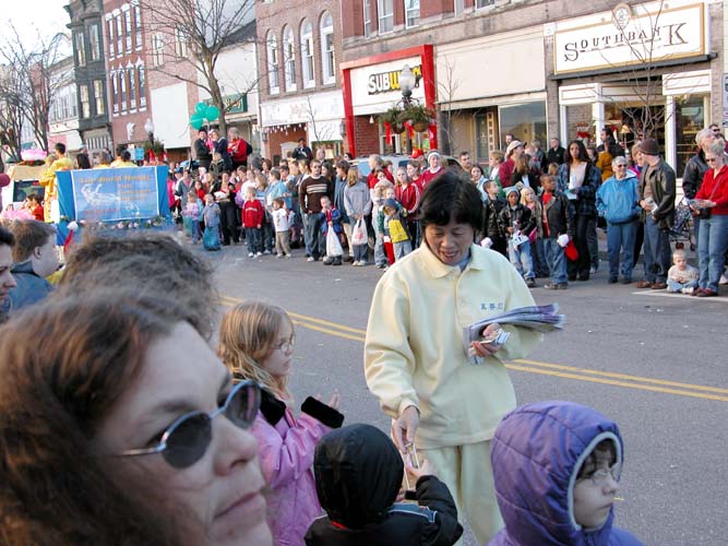 当法轮功学员的队伍经过时,蓝底金字的“法轮大法”横幅,装饰清新典雅的花车,舒缓祥和的功法演示赢得人们热烈的掌声和喝彩。法轮大法“真善忍”更是触动着许许多多人的心灵。六、七位发资料的学员跑前跑后,忙得不可开交,也满足不了人们一只只热切索要资料的手。游行还没有结束,准备好的法轮功真象报纸、传单、书签等就发放一空。事后,学员都觉得很惋惜,没有带更多的资料。
