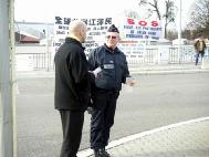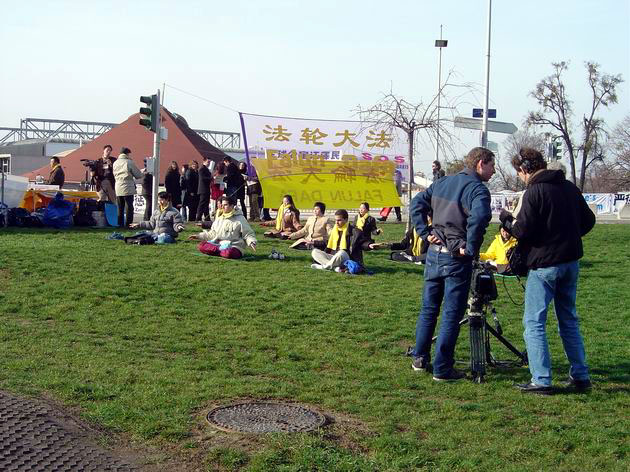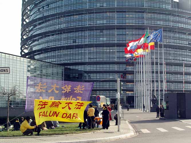 【明慧网2004年2月13日】正值欧洲议会成员在斯特拉斯堡议会中心举行例行工作会议之际,法轮功学员在欧洲议会门前举行请愿活动并召开新闻发布会,呼吁议会关注胡锦涛访问法国期间,法国警方出于中方压力拘捕法轮功学员事件。